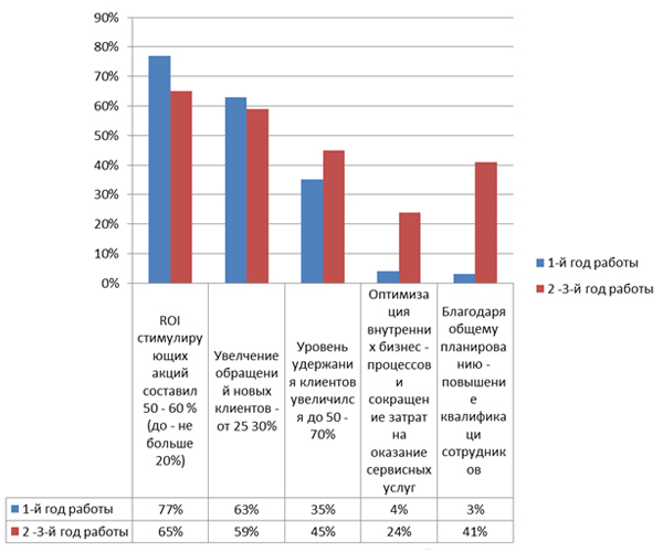 Рис.4: Анализ основных результатов работы специалистов по рекламе и маркетингу в 1- 3-й год работы в компаниях Москвы и Санкт-Петербурга малого и среднего бизнеса (на рынках B2B и B2C). В исследовании приняли участие 45 организаций.